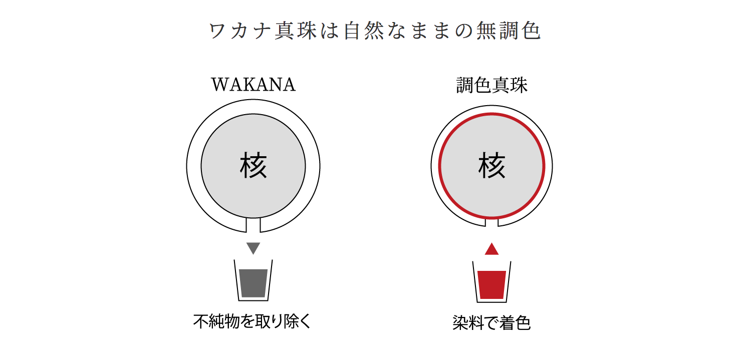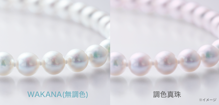 ワカナの無調色真珠は、汚れを取り除くだけで調色処理を行わないため、真珠本来の美しさを楽しむことができます。